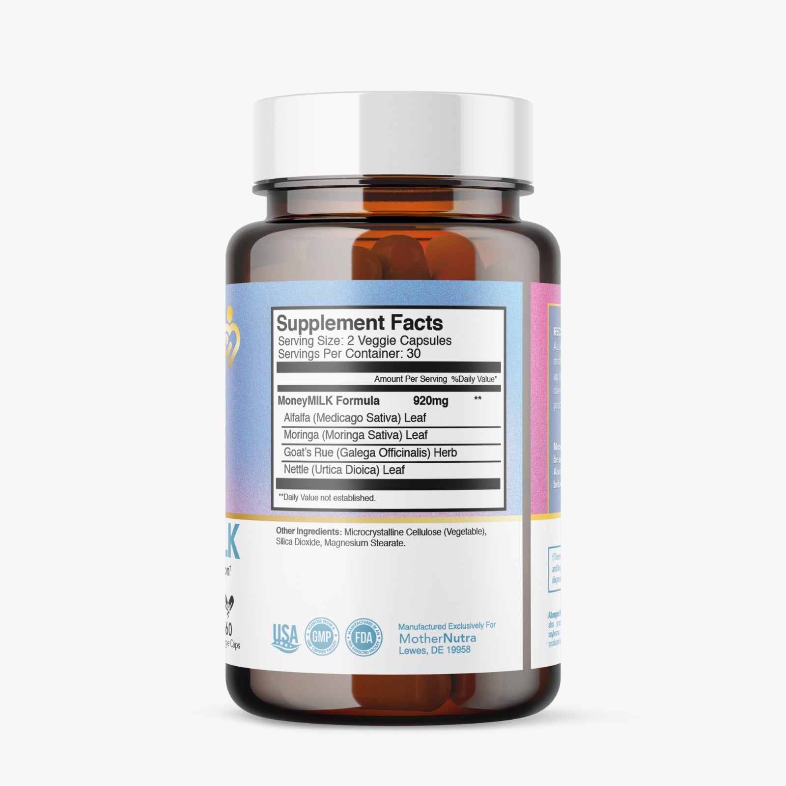 MoneyMilk is a unique blend of alfalfa (medicago sativa), moringa leaf (moringa sativa), goats rue, and nettle leaf - supportive herbs that work together to provide the nutrients your body needs to produce quality breast milk.