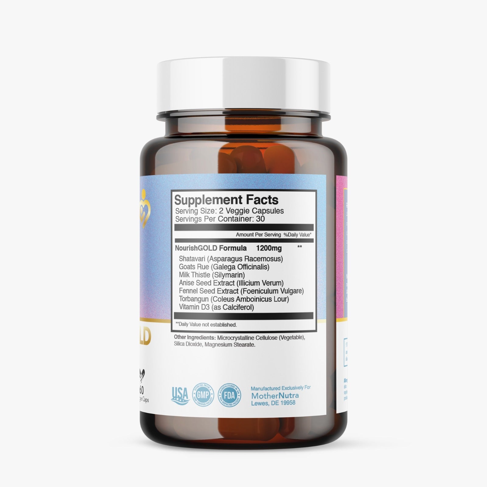 Nourish Gold is the only lactation supplement that provides a complete blend of ingredients to support optimal milk production. Our unique formula contains Shatavari (Asparagus Racemosus), Goat's Rue (Galega Officinalis), Milk Thistle (Silymarin), Anise Seed Extract (Illicium Verum), Fennel Seed Extract (Foeniculum Vulgare), Torbangun (Coleus Amboinicus Lour), and Vitamin D3 (as Calciferol).